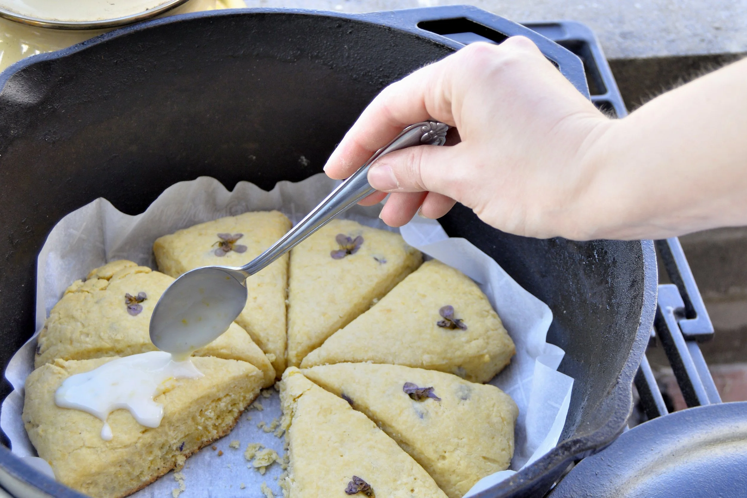 Garnish the top of your scones with fresh or candied violets to your aesthetic liking. (Optional)
