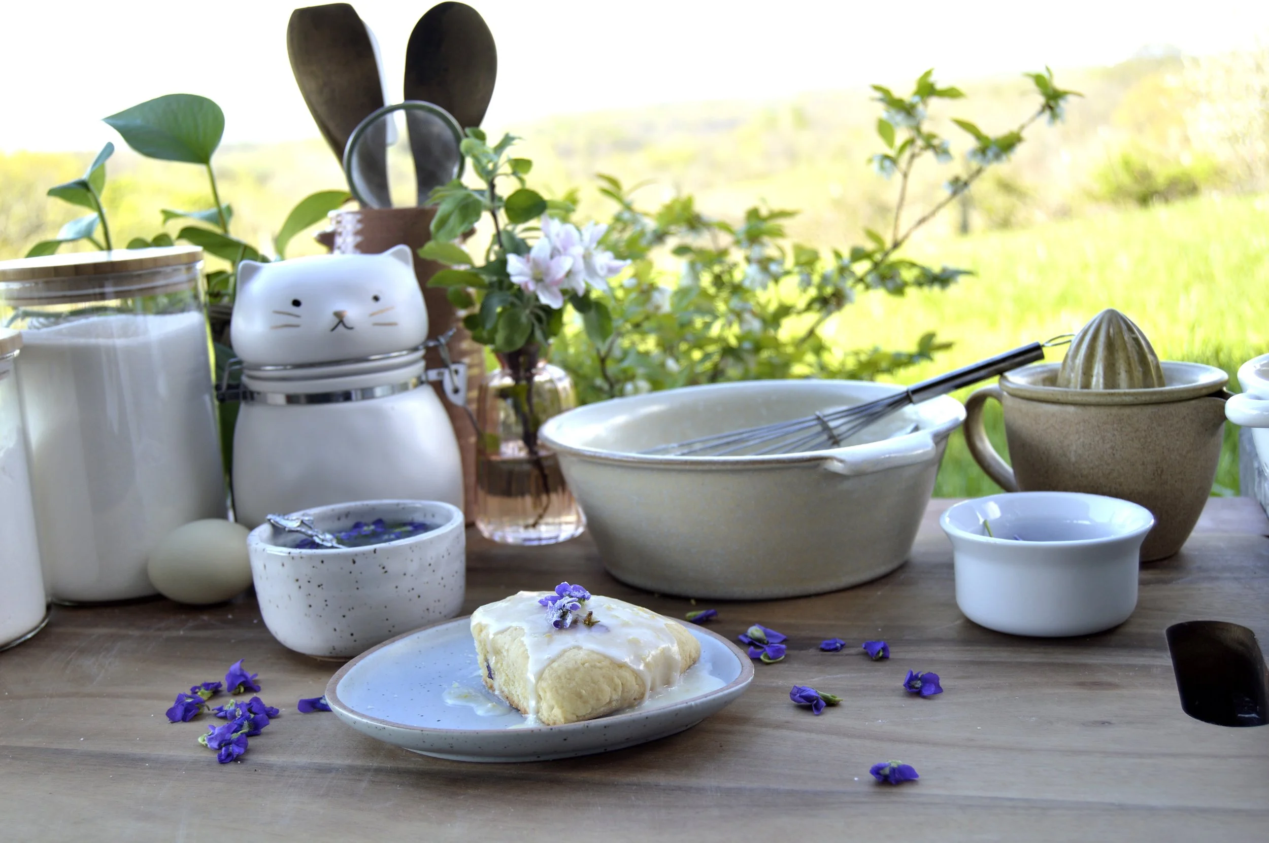 These perfectly soft, tangy, and sweet scones are the best springtime treat to welcome us back into the warmer weather. They’re also surprisingly easy to put together! Plus, foraging for fresh violet blossoms under a bright blue sky lifts the spirit like nothing else does. Violets are symbolic of faith, mystical awareness, inspiration, and spiritual passion. Violet flowers and leaves contain very high amounts of vitamin C, as well as anthocyanins and antioxidants, which can benefit vascular health, blood circulation, and inflammation.