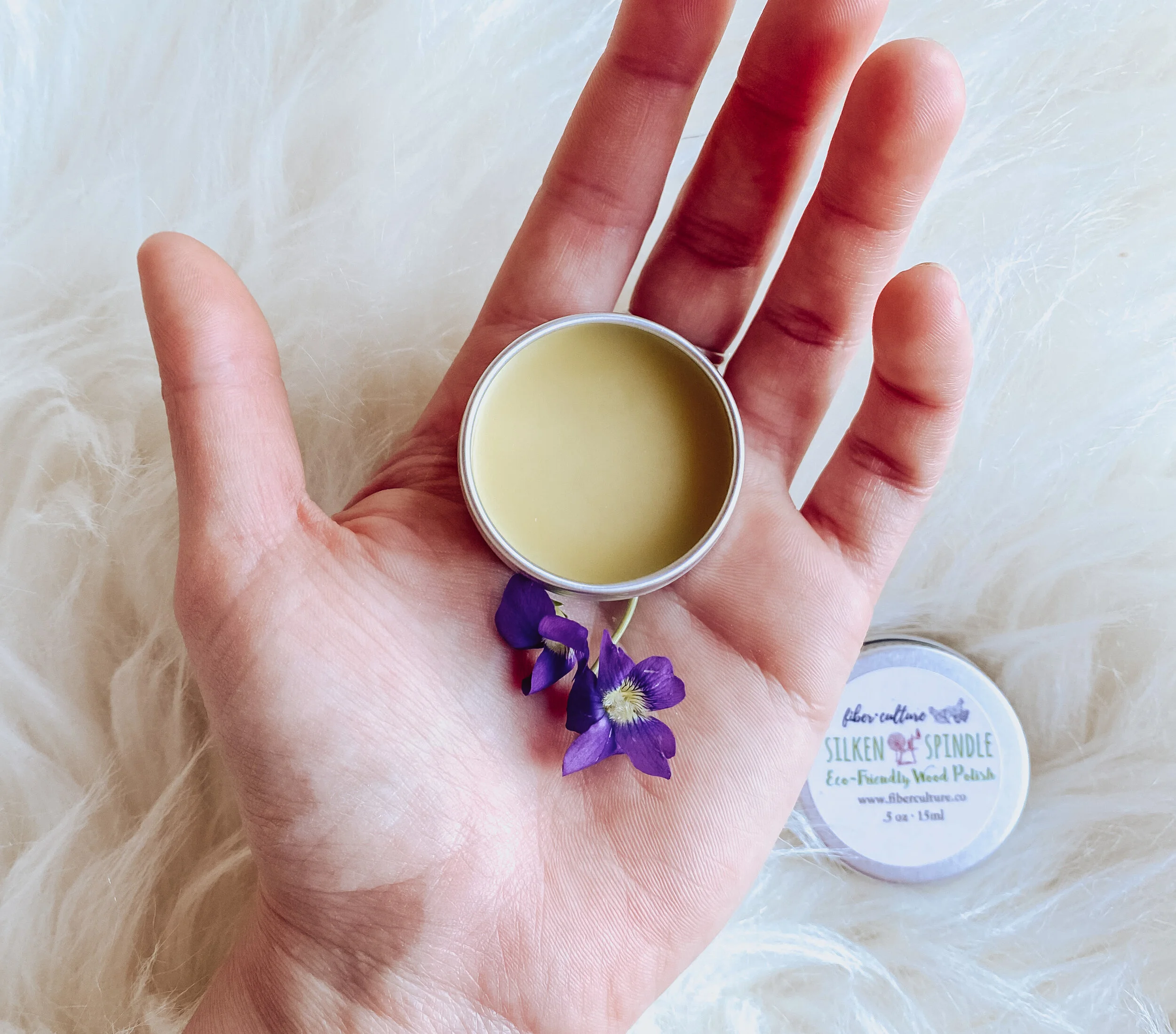 - .5 oz Tin of Silken Spindle Eco Friendly Wood Balm